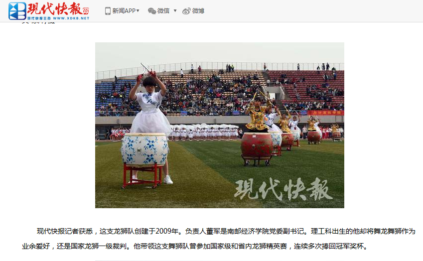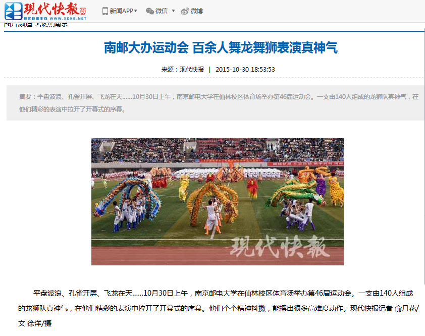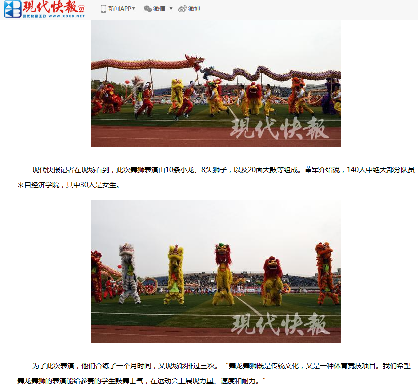 10月30日上午,Bwin必赢线路检测中心在仙林校区体育场举办第46届运动会。必赢官网代表队方阵步伐整齐矫健、口号铿锵有力,舞龙舞狮气势如虹,充分展现了经院人的精、气、神!开幕式表演环节,大学生龙狮团带来了舞龙舞狮表演《水鼓,中国龙》,由140人组成他们精彩演绎了平盘波浪、孔雀开屏、飞龙在天等一系列高难度动作,祝愿学校运动会圆满成功,赢得了现场师生的阵阵掌声。现代快报进行了相关报道。