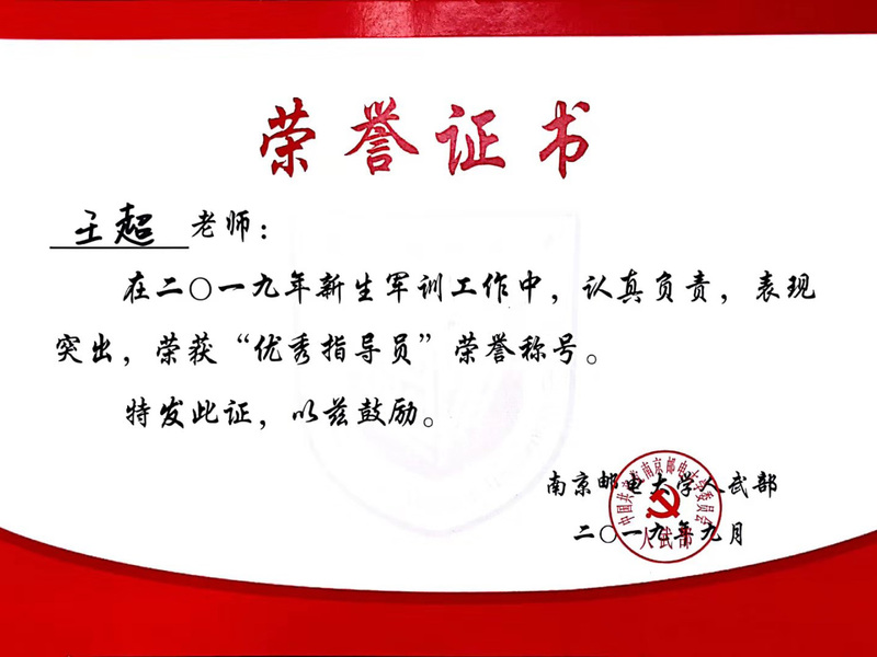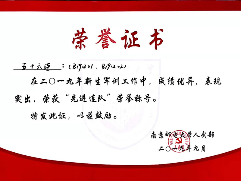 在军训汇演表彰大会上,Bwin必赢线路检测中心56连荣获“先进连队”荣誉称号,指导员王超老师荣获“优秀指导员”荣誉称号,承训教官荣获“优秀教官”荣誉称号,王子杭等14名学生荣获“军训标兵”荣誉称号。