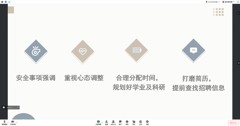 王老师从安全事项、心态调整、时间规划、简历打磨四方面出发进行了重点强调。安全事项方面,王老师主要针对人身安全、交通安全、饮食安全、网络安全进行了强调,叮嘱同学们要牢固树立安全意识,任何时候把安全放在第一位。心态调整方面,王老师提醒同学们要重视压力的缓解与心态的调整,遇事多与家长、导师、辅导员沟通交流。时间规划方面,王老师提醒同学们要注意进行时间的合理分配,规划好自己的时间安排。简历打磨方面,王老师为同学们进行了简历制作的介绍,提醒同学们提早准备好自己的简历,耐心修改打磨,同时多渠道查找招聘信息,提早做好就业准备。